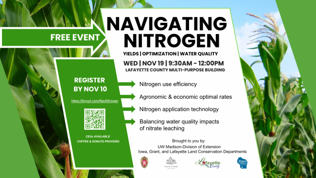 Farmers and Crop Advisors, join us for a workshop to optimize your nitrogen use! Learn how and why to assess your nitrogen efficiency, and how you can maximize your fertilizer investment. Presenters will be UW-Madison Division of Extension experts. Free Registration. CEUs available. Register by November 10.